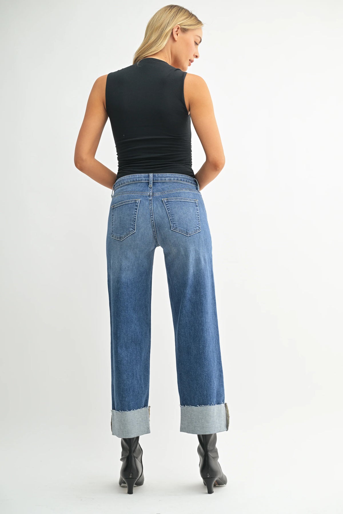With a mid-rise waist and relaxed wide-leg fit, these jeans fuse vintage flair with modern edge. A raw scissor-cut hem adds attitude, while cuffed hems keep the look refined.