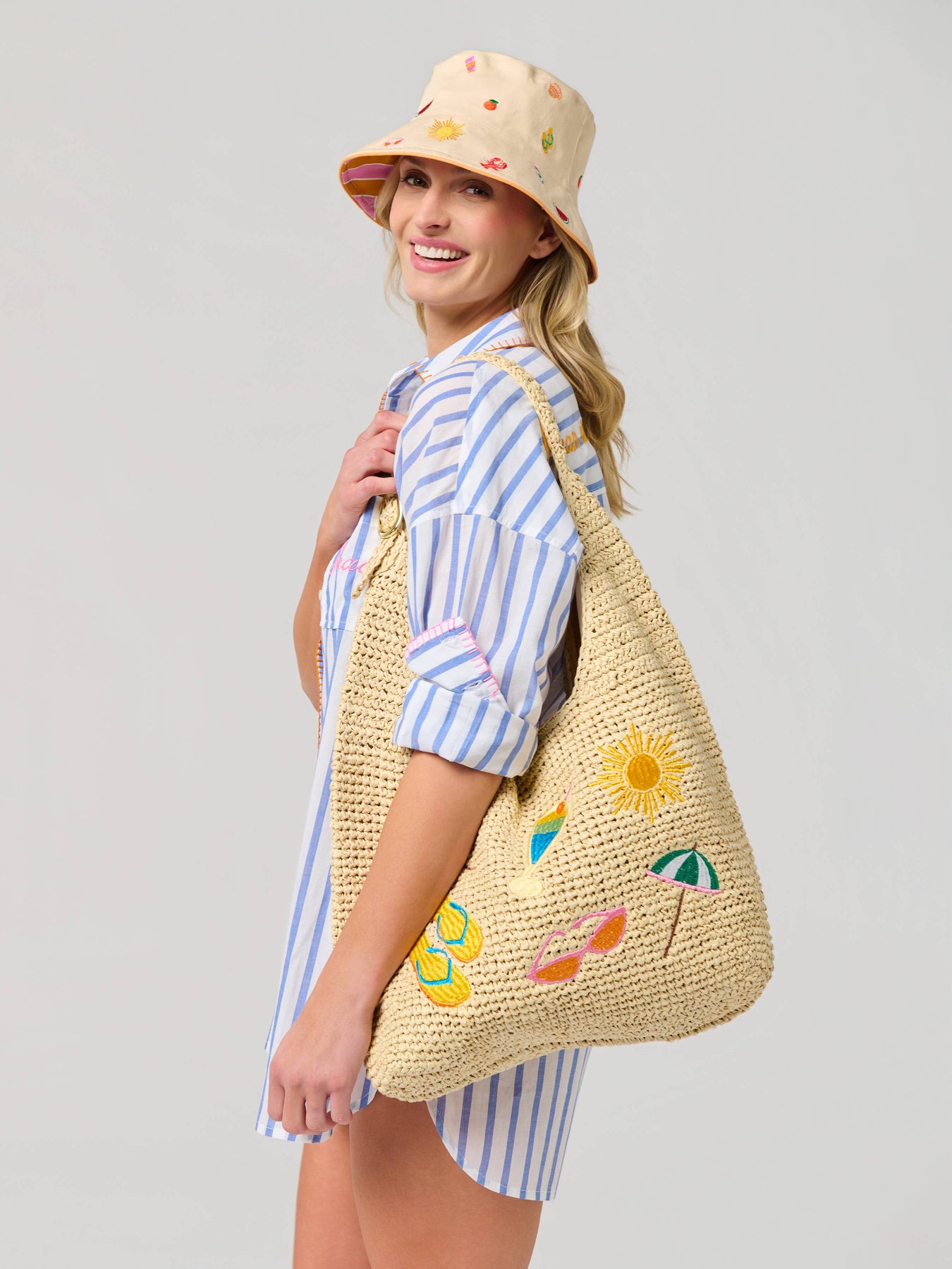 L 19.25" x W 4" x H 21"; strap 11"; paper straw and polyester; gold hardware; single, adjustable shoulder strap; magnetic snap closure; 2 inner slip pockets; 1 inner zip pocket