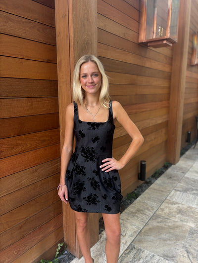 Black Embroidered Flower Square Neck Puff Sleeve Maxi Dress
