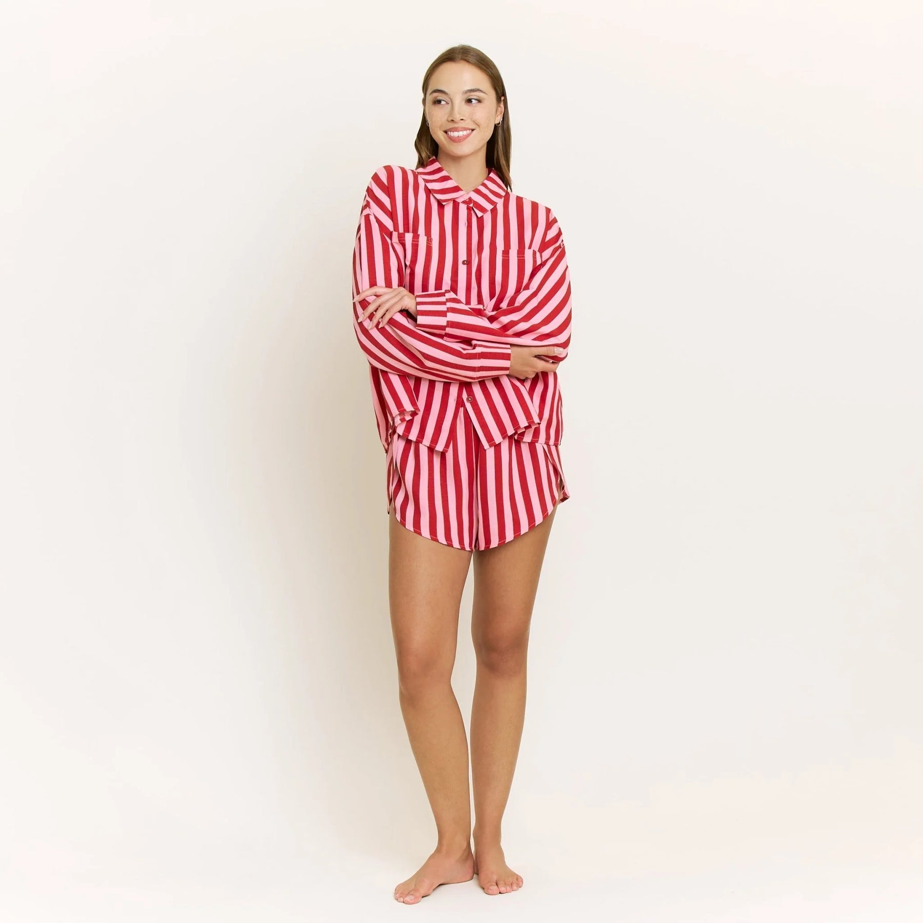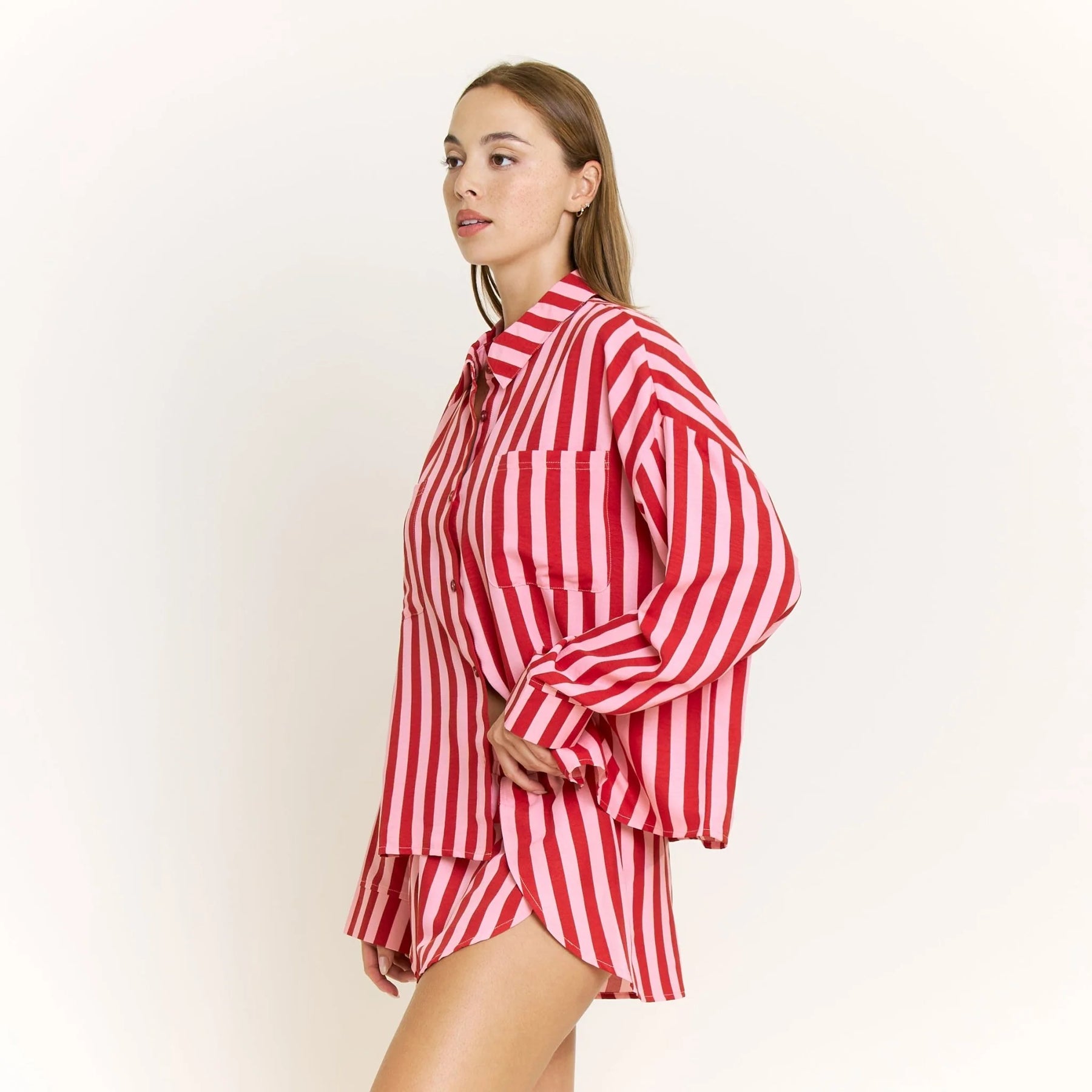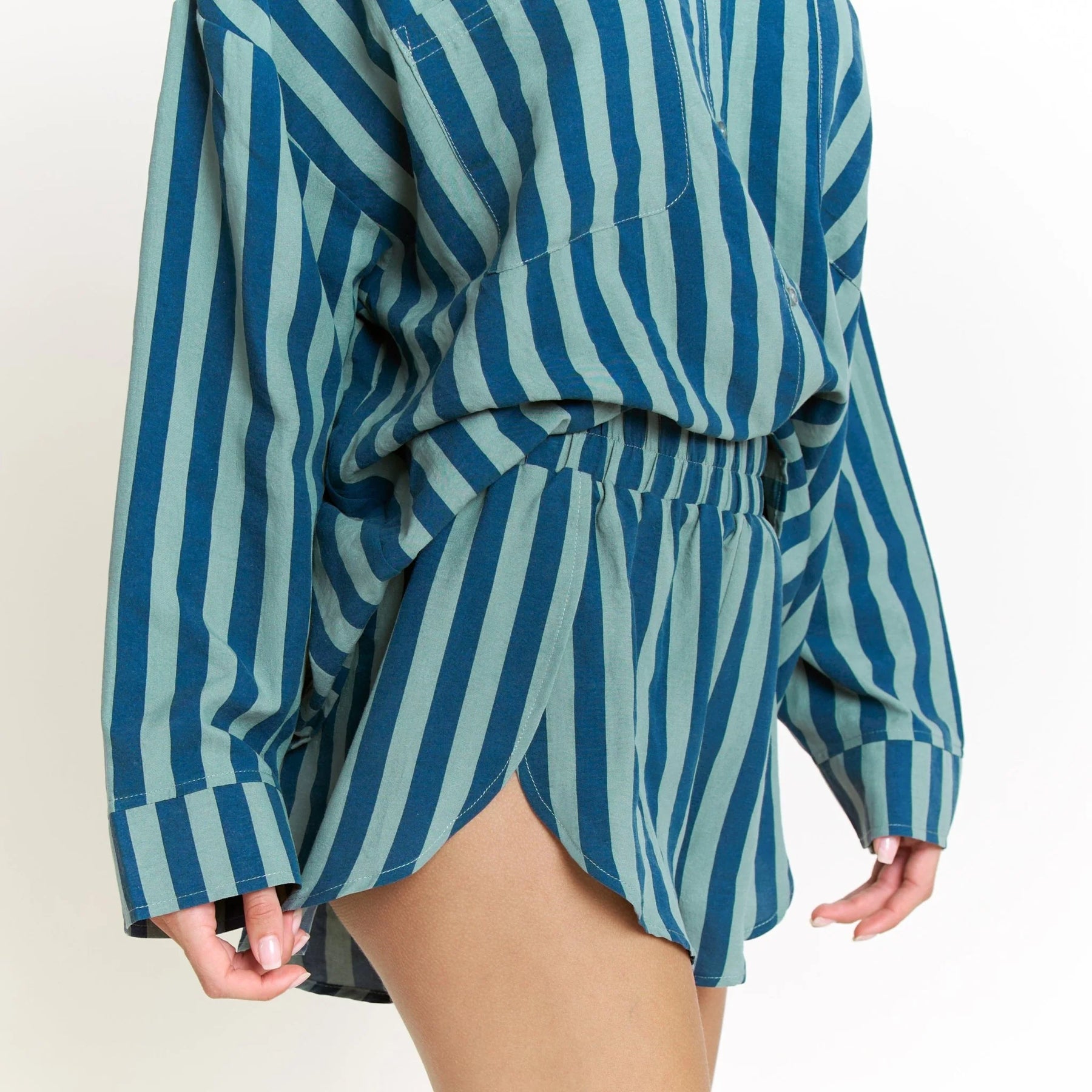 A button down long sleeve notch collar short paired with side-slit shorts in a soft, cotton-like fabric.